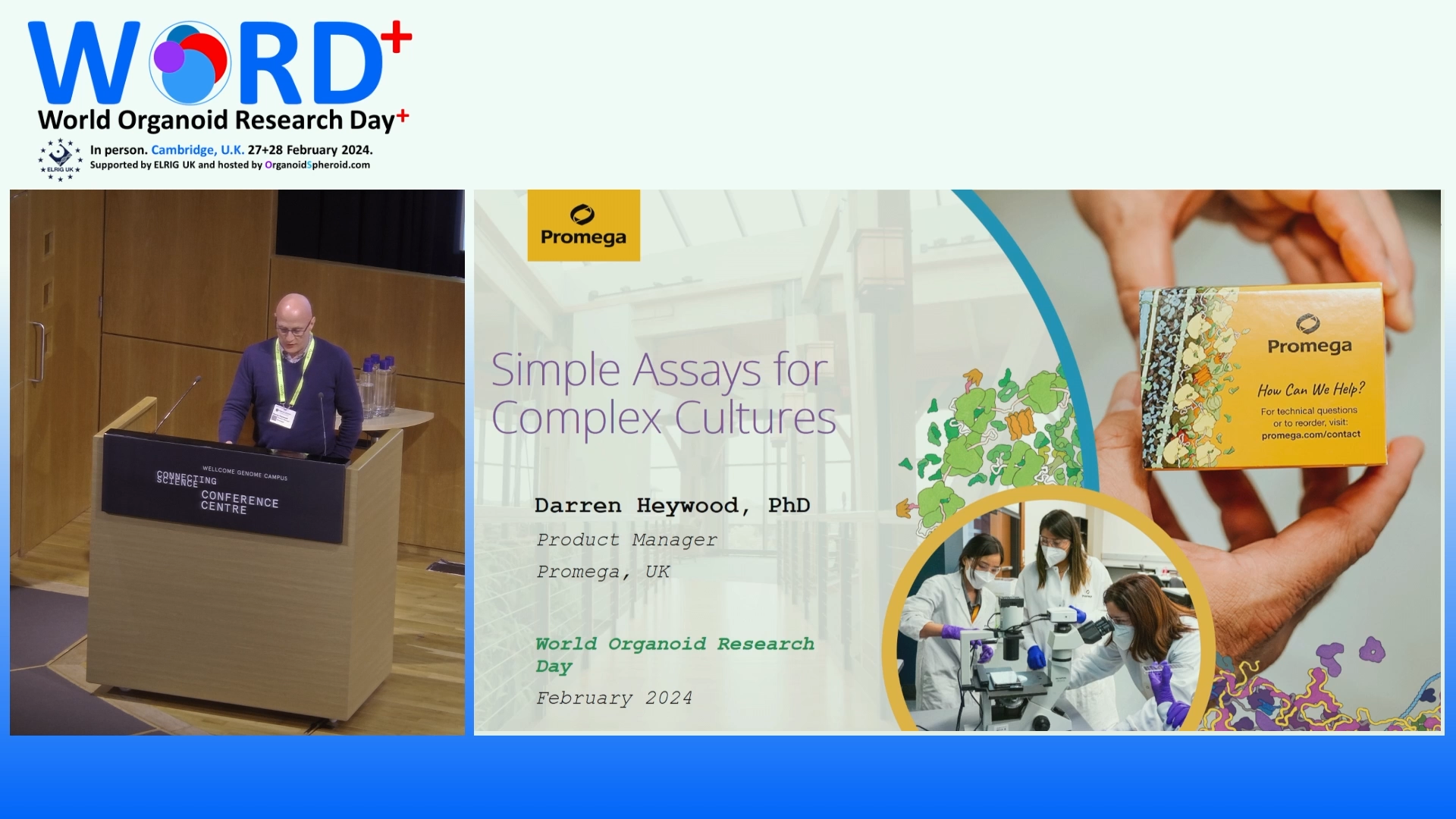 Dr Darren Heywood is a Cell Health assay Product Manager at Promega UK. In his 5-minute presentation at the World Organoid Research Day 2024 Conference, Darren provides an overview of Promega's cell-based assays optimised for 3D cell cultures and highlights the use of endpoint assays for measuring critical cellular events at fixed time points, media sampling assays for analysing biomarkers secreted into the culture medium and real-time assays for continuous monitoring of cell health in 3D culture models.