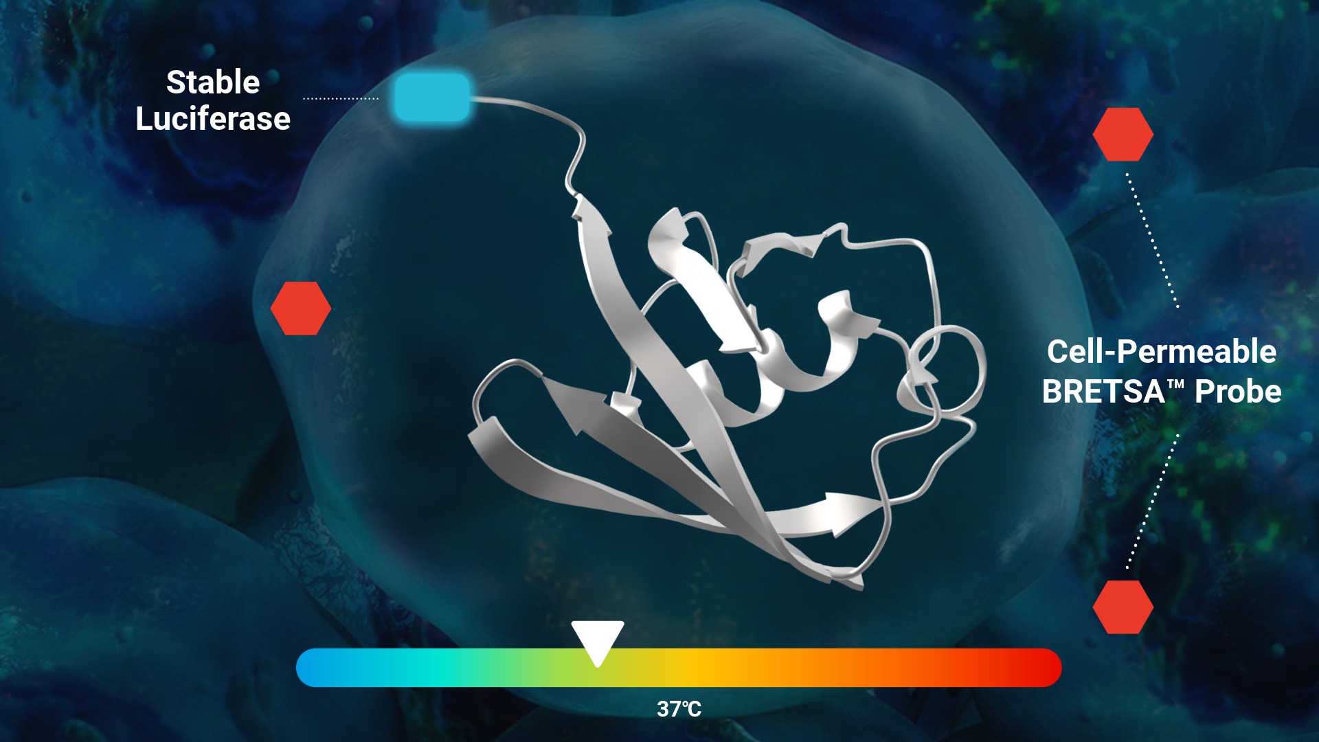 - Start with a luciferase-tagged target expressed in cells. At low temperature, the luciferase-fused target protein is folded. The cell-permeable BRETSA™ probe shows minimal interaction with the folded protein.